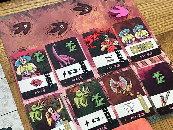 The production quality in Cretaceous Rails is top-notch. The dinosaur miniatures are beautifully sculpted and come in a variety of colours, adding visual interest and helping with gameplay clarity. The tourist figures are detailed and distinct, and the train pieces – while a bit fiddly for larger hands – are impressive in their design. The wooden tree tokens are a curious but effective choice (and I did wonder why matching plastic wasn’t used), and the player boards are well laid out with clear iconography. The cards are sturdy and attractively illustrated, and while the rulebook occasionally requires a bit of perusing to clarify iconography, it’s generally well written and easy to follow.