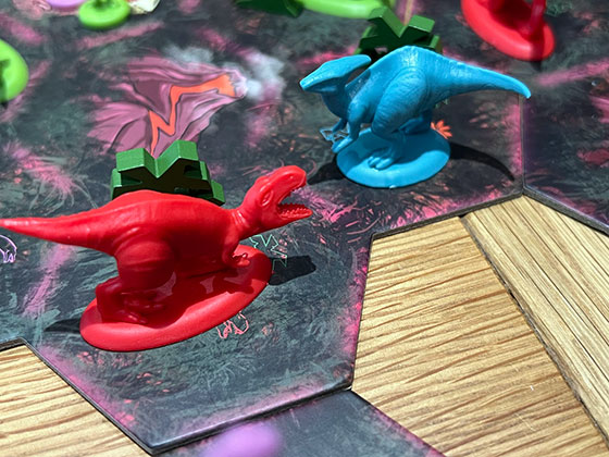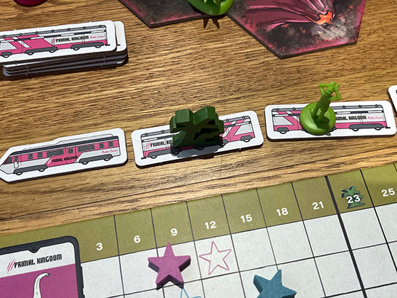 The actions themselves are straightforward but interwoven in satisfying ways. Laying track expands your network, allowing you to reach new hexes and transport tourists. Clearing jungle improves visibility and increase the value of the (now visible) nearby dinosaurs. Capturing dinosaurs adds them to your resort, where they contribute to scoring and unlock special abilities. Taking tourists on tours boosts your income and reputation, while upgrading your resort provides long-term benefits and scoring opportunities. It’s a system that encourages forward planning but also rewards flexibility, and the limited number of turns per round means every decision feels meaningful.