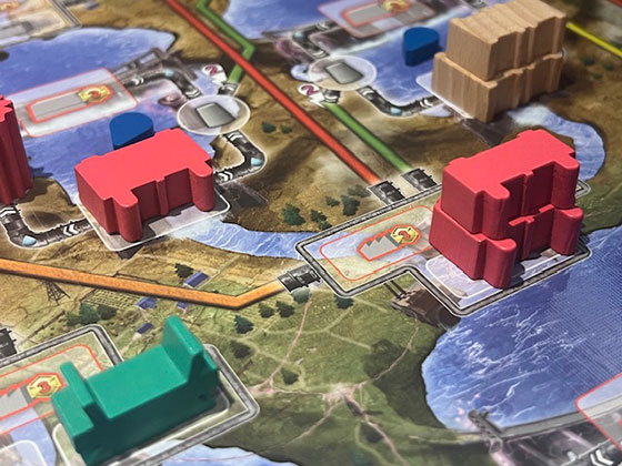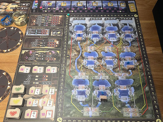 Visually, Barrage is striking. The board is a stylised map of alpine terrain, with crisp iconography and a muted industrial palette. The components are functional and thematic – plastic dams, cardboard conduits, and chunky resource tokens. The construction wheels are particularly satisfying, with rotating dials that track resource recovery. The graphic design is dense but readable, and while the rulebook has been criticised in earlier editions for clarity issues, more recent printings and community resources have helped smooth the learning curve.