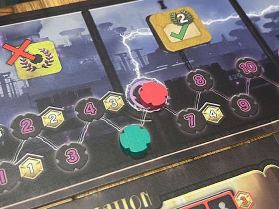 Scoring is based on energy production and contract fulfilment. Each round, players earn points based on how much energy they generate, with bonuses for hitting production thresholds. Contracts offer additional rewards for meeting specific conditions—producing a certain amount of energy in one turn, or using specific types of structures. These contracts are public and limited, adding another layer of competition.